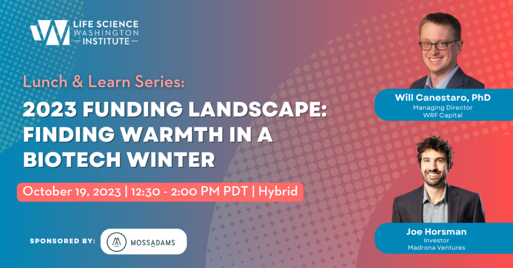 Join Madrona Venture Group Investor Joe Horsman and WRF Capital Managing Director, Will Canestaro, for a hybrid Lunch and Learn session hosted by Life Science Washington Institute on the current state of the life science and biotech funding environment.
