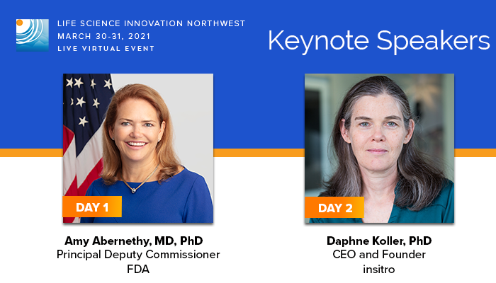 Announcing the 2021 keynote speakers Amy Abernethy, MD, PhD, Principal Deputy Commissioner, FDA, and Daphne Koller, PhD, CEO & Founder, insitro!