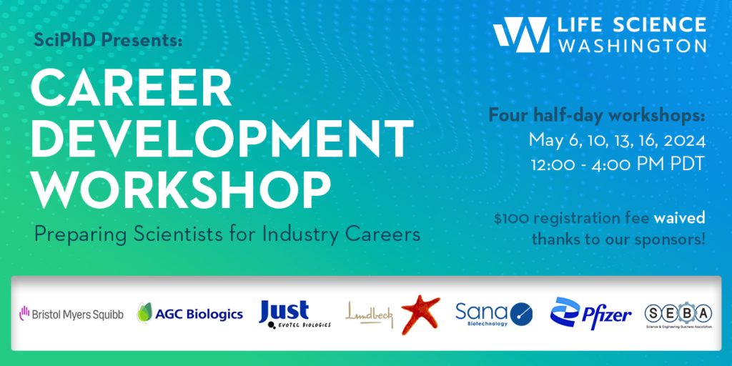 Join Life Science Washington Institute for a free “Learn By Doing” workshop presented by SciPhD on May 6, 10, 13, and 16, 2024 from 12:00 – 4:00 PM.